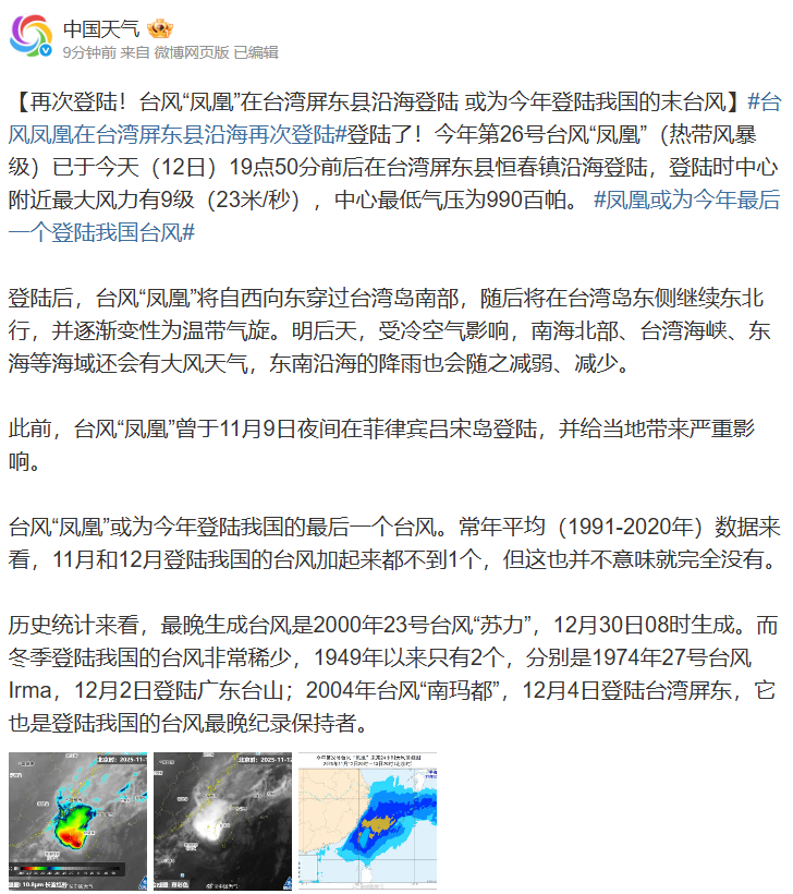 今年第26號臺風“鳳凰”(熱帶風暴級)已于12日19時50分前后在臺灣屏東縣恒春鎮沿海登陸,登陸時中心附近最大風力有9級(23米/秒),中心最低氣壓為990百帕。