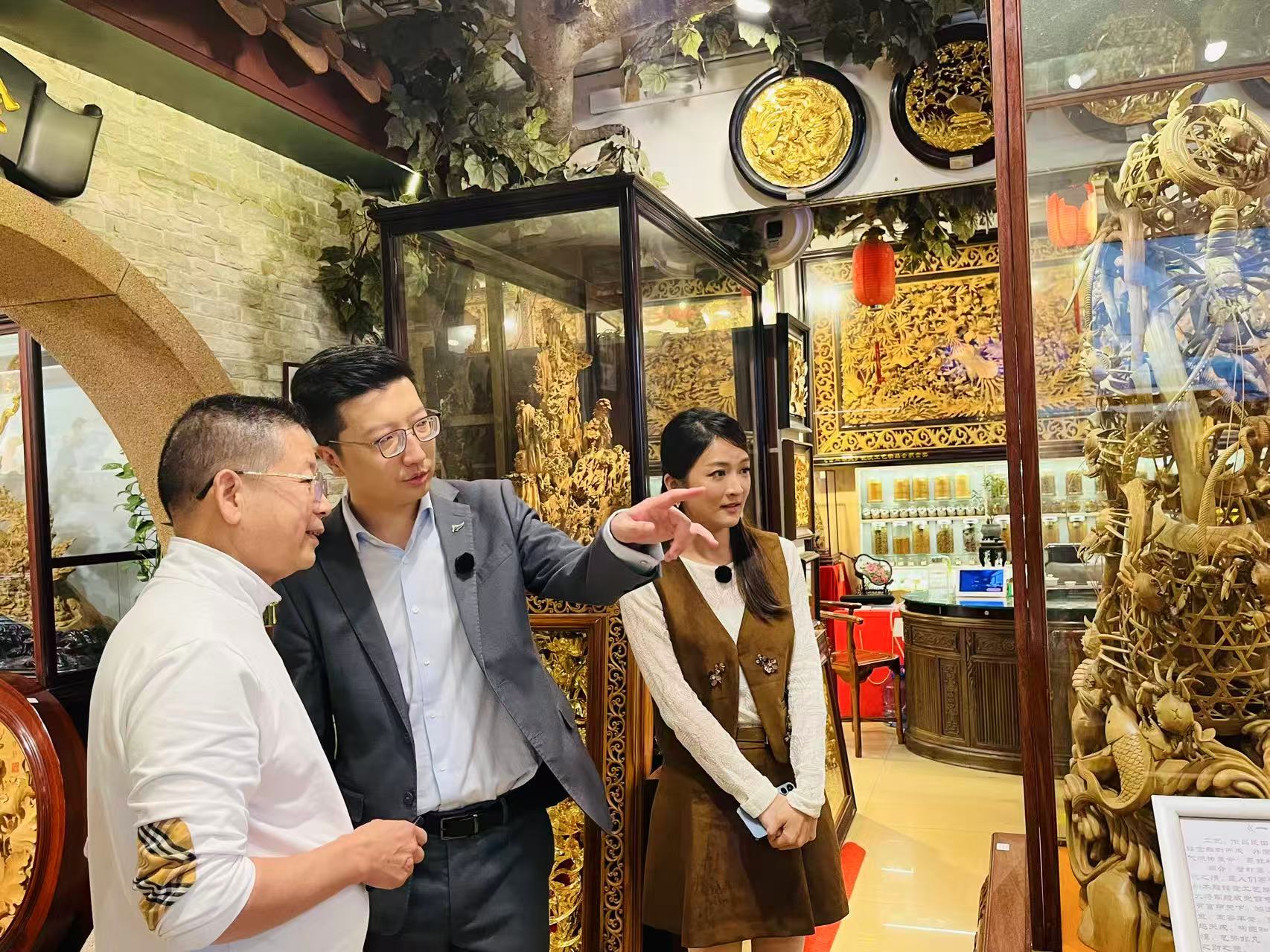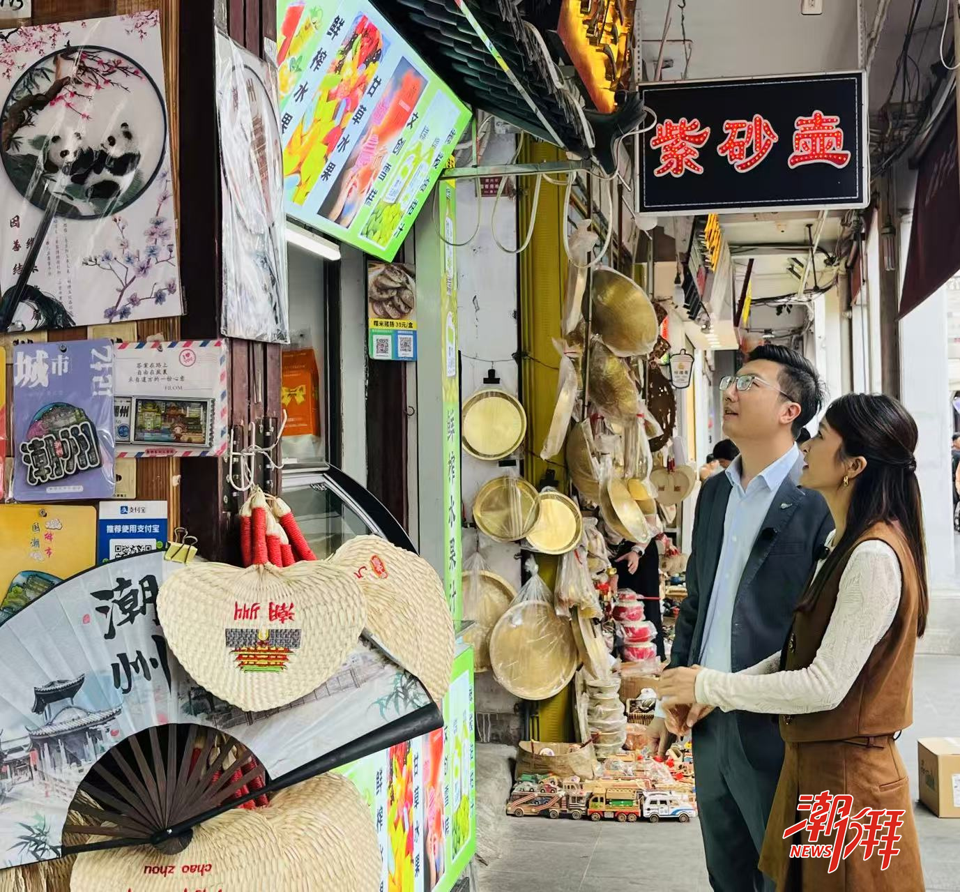 當天下午,張典一行漫步潮州古城,先后走訪廣濟橋、牌坊街等標志性景點,開啟了一場“潮味”之旅。在牌坊街的一家潮州木雕藝術館內,他駐足欣賞“金漆蝦蟹簍”等精美木雕作品,并與木雕藝人深入交流,了解這項國家級非遺的技藝精髓與應用場景,對潮州木雕的精湛工藝贊不絕口;走進工夫茶館,他靜靜欣賞了茶藝師行云流水般的“潮州工夫茶二十一式”演示,細品鳳凰單叢的氤氳茶香,聆聽韻味悠長的潮劇唱段……“這是我首次到訪潮州,親身體驗比想象中更精彩!”張典表示,此前已通過美食與文化對潮州有所了解,此次實地探訪更添期待。