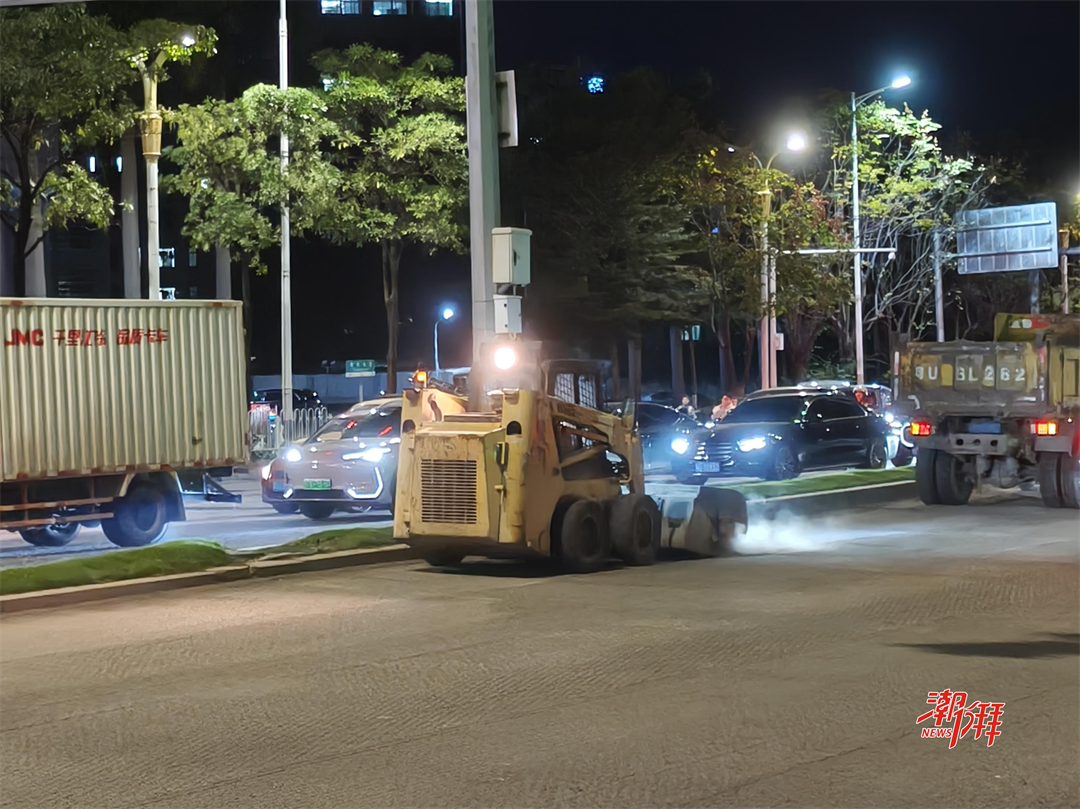 13日晚11時(shí)許,記者在潮楓路和潮州大道交界處看到,路面清潔機(jī)械正來(lái)回穿梭,將路面雜物清理干凈。待深夜車(chē)流量進(jìn)一步減少后,工人們迅速投入到瀝青面層的攤鋪工作中。