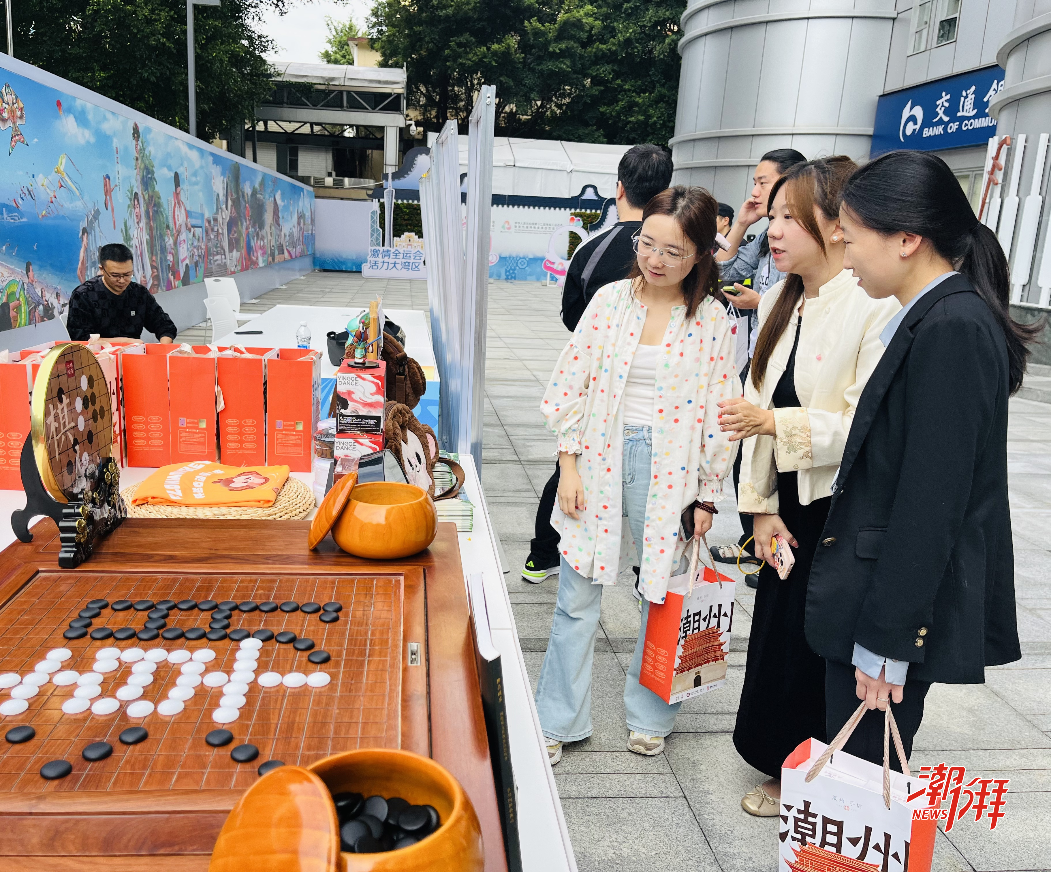 在城市體育性格文創集市潮州展區,濃厚的“潮味”與棋韻撲面而來。展區以“全國圍棋之鄉”為核心,將圍棋與“府樓猴”IP形象、潮繡、木雕、工夫茶、陶瓷等非遺技藝跨界碰撞,一系列創意十足的文創產品吸引眾人駐足。圍棋工夫茶具套裝將黑白棋韻融入茶器肌理,圍棋手串以溫潤材質串聯起智慧符號,繡有圍棋圖案的珠繡扇子在陽光下流轉光澤,圍棋陶瓷杯則將瓷藝的細膩與棋道的深邃完美融合,“府樓猴”英歌玩偶更是活靈活現,每一件作品都盡顯潮州文化的獨特內涵。更引人注目的是,展區中央以潮州木雕精心打造的圍棋臺搭建起挑戰擂臺,木紋的精致與棋盤的規整相得益彰,不少嘉賓上臺比試,落子間盡顯博弈樂趣,挑戰成功者還能得到潮州特色文創禮品,現場氛圍十分熱烈。